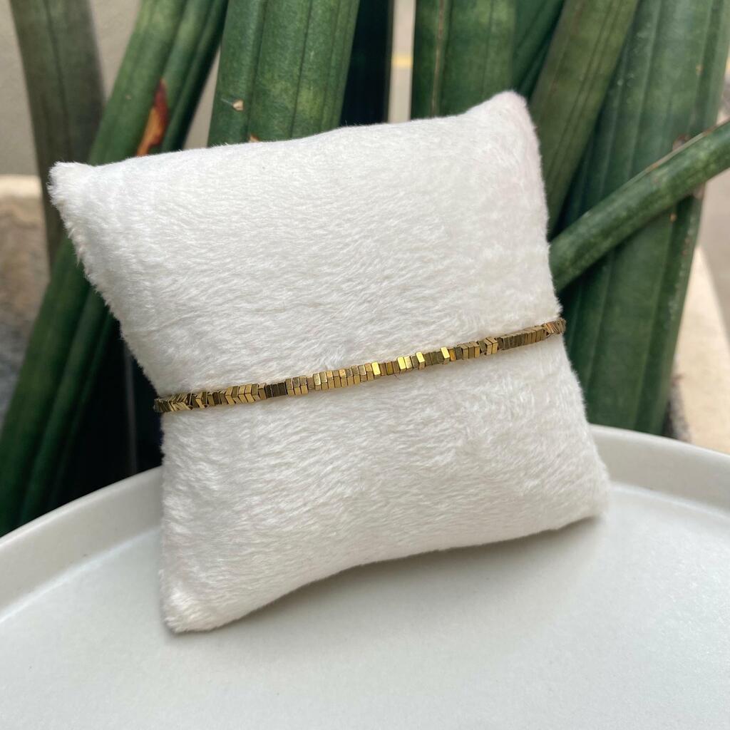 Pulseira feita a mão com mini pedras de Hematita com banho de ouro. Fecho ajustável ao pulso.